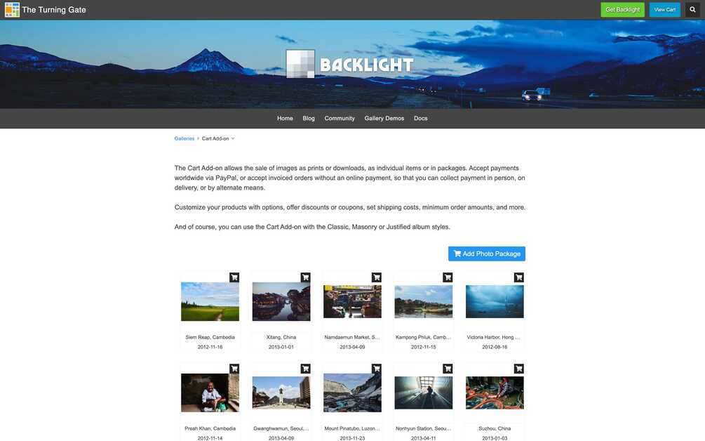The Cart Add-on adds shopping cart functionality to your Backlight pages and image galleries. The cart can be used to sell digital image downloads, photo prints, photo packages, or other physical goods or services. The cart accepts online payment via PayPal, or can be used to create invoiced orders, allowing the photographer to collect payment offline or by alternate means. Salable items may be setup with any number of additional purchase options. Orders are sent to your email, and are saved to Backlight's dashboard as backup.