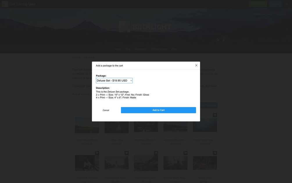 The Cart Add-on adds shopping cart functionality to your Backlight pages and image galleries. The cart can be used to sell digital image downloads, photo prints, photo packages, or other physical goods or services. The cart accepts online payment via PayPal, or can be used to create invoiced orders, allowing the photographer to collect payment offline or by alternate means. Salable items may be setup with any number of additional purchase options. Orders are sent to your email, and are saved to Backlight's dashboard as backup.